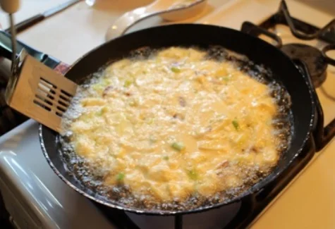 You should have some fairly aggressive bubbles forming along the edges of your frying pan. Using a spatula get under the frittata and allow the oil to work itself in those crevices to prevent sticking. Once you notice the edges of the frittata beginning to crisp up and are able to pry it away from the pan give it a flip using two spatulas