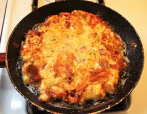Begin by heating a 9 inch frying pan with a centimeter of vegetable oil over medium high heat. Once the oil is hot you are ready to place your batter.